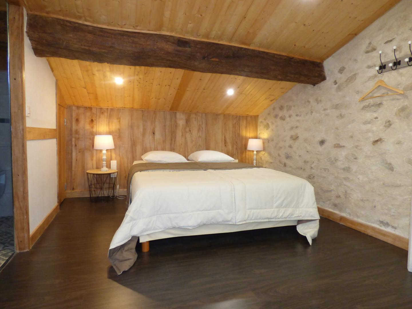 Une chambre d'hôtes pour deux personnes, aménagé dans un ancien grenier de la ferme. Accès indépendant depuis le jardin, vous entrez d'abord par une véranda ensoleillée dotée d'une kitchenette. La chambre accueille un lit double 160x200cm, chaleureuse et boisée. Salle d'eau privative.