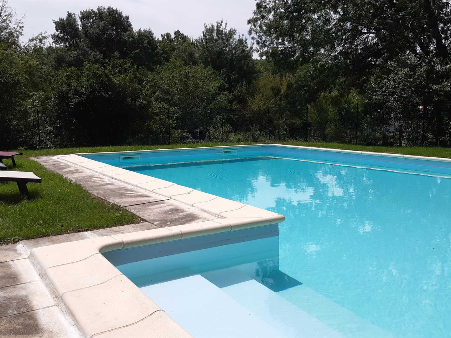 Le jardin est en deux parties : pelouse sur le devant, et grand jardin à l'arrière, où se trouve la piscine (dimensions 10x5m, profondeur de 1m à 1,7m) Terrasse avec vue sur la piscine, coin repas extérieur sous abri avec salon de jardin, plancha