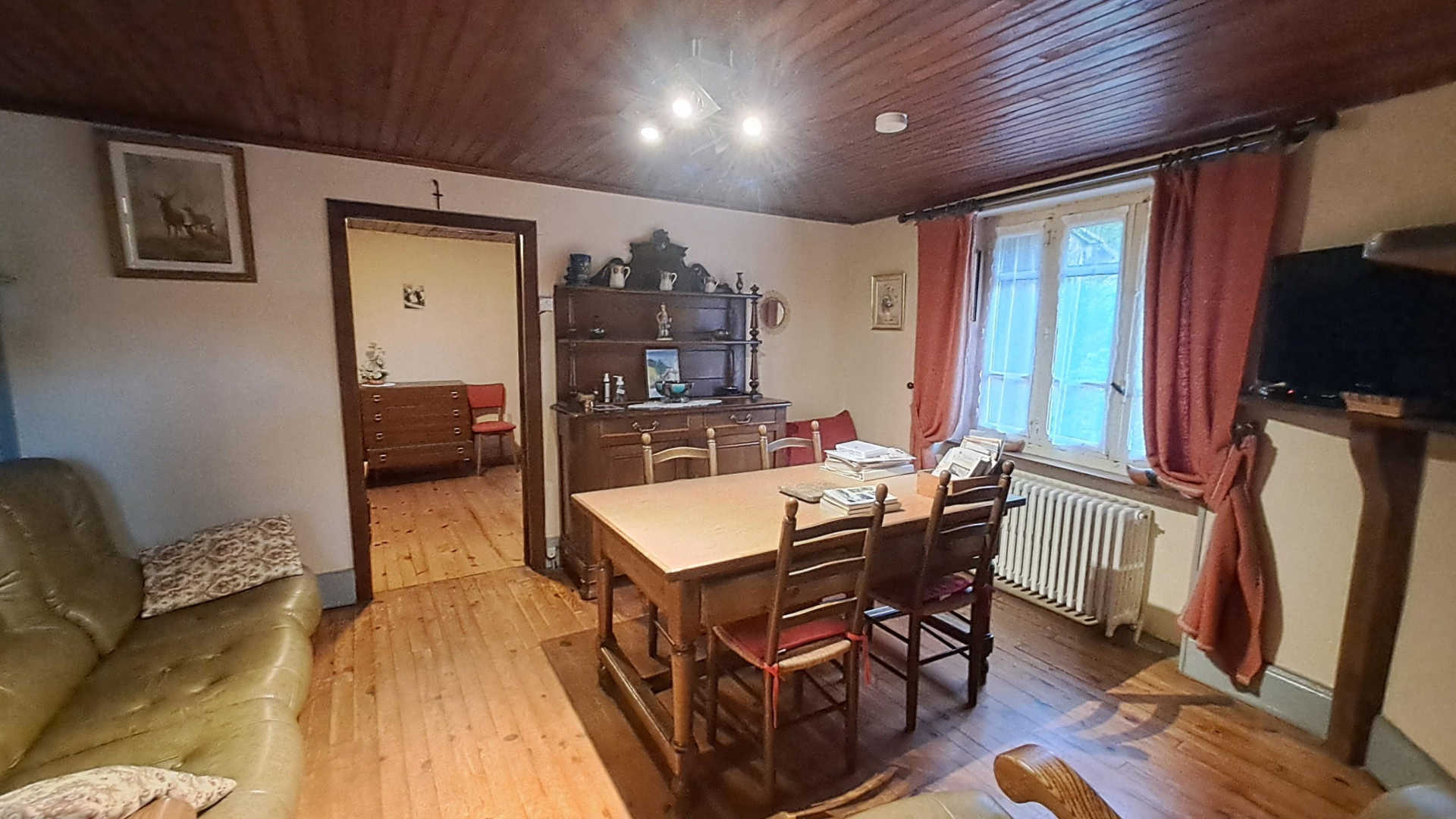 - Séjour avec table à manger, canapé et TV.
