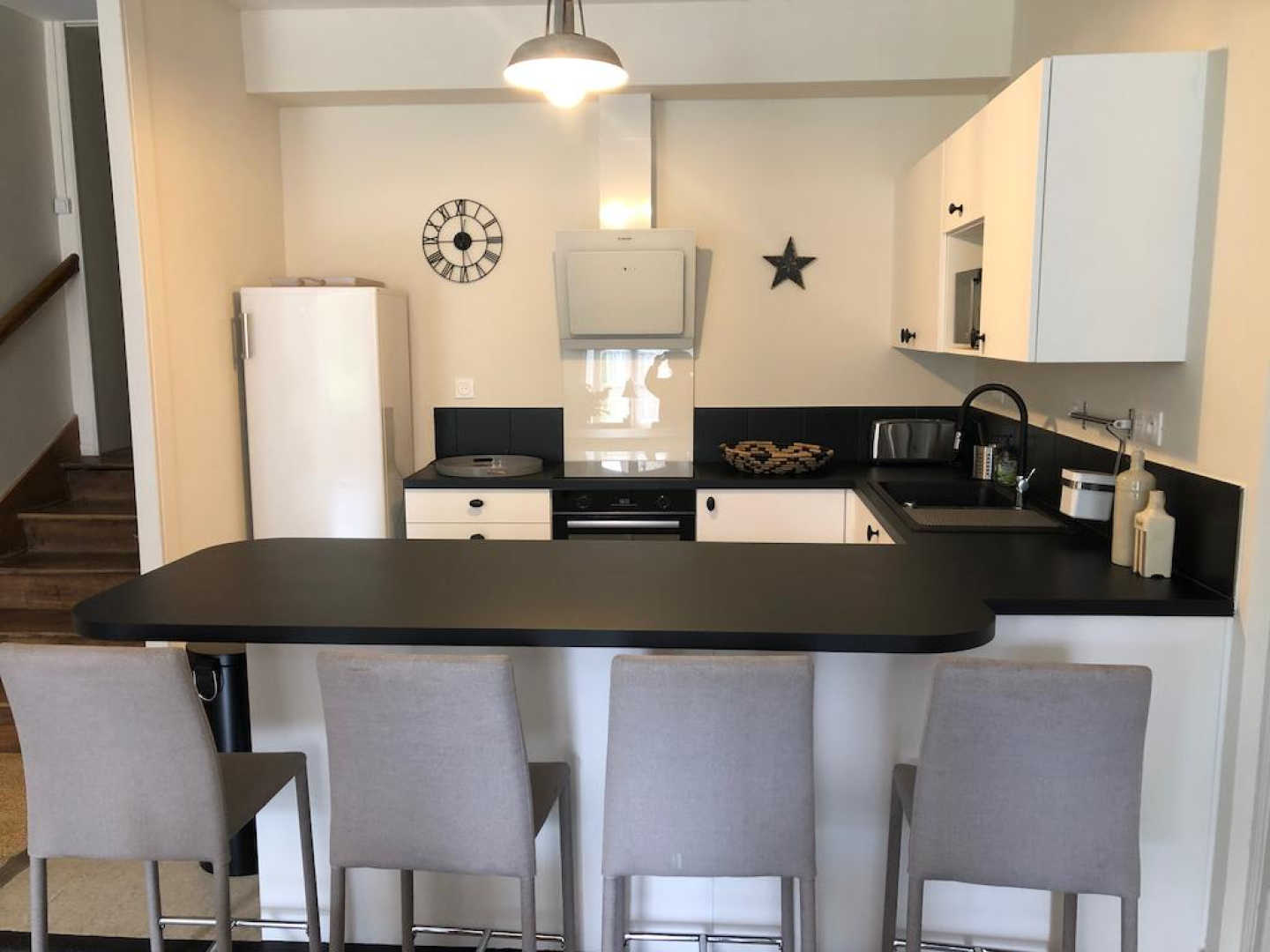 On entre dans le gîte directement dans la grande salle à manger avec cuisine ouverte toute équipée (réfrigérateur, four, lave-vaisselle, micro-ondes, cafetière filtre + Nespresso, barbecue électrique), comptoir et chaise hautes, grande table (jusqu'à 14 couverts), vaisselier.