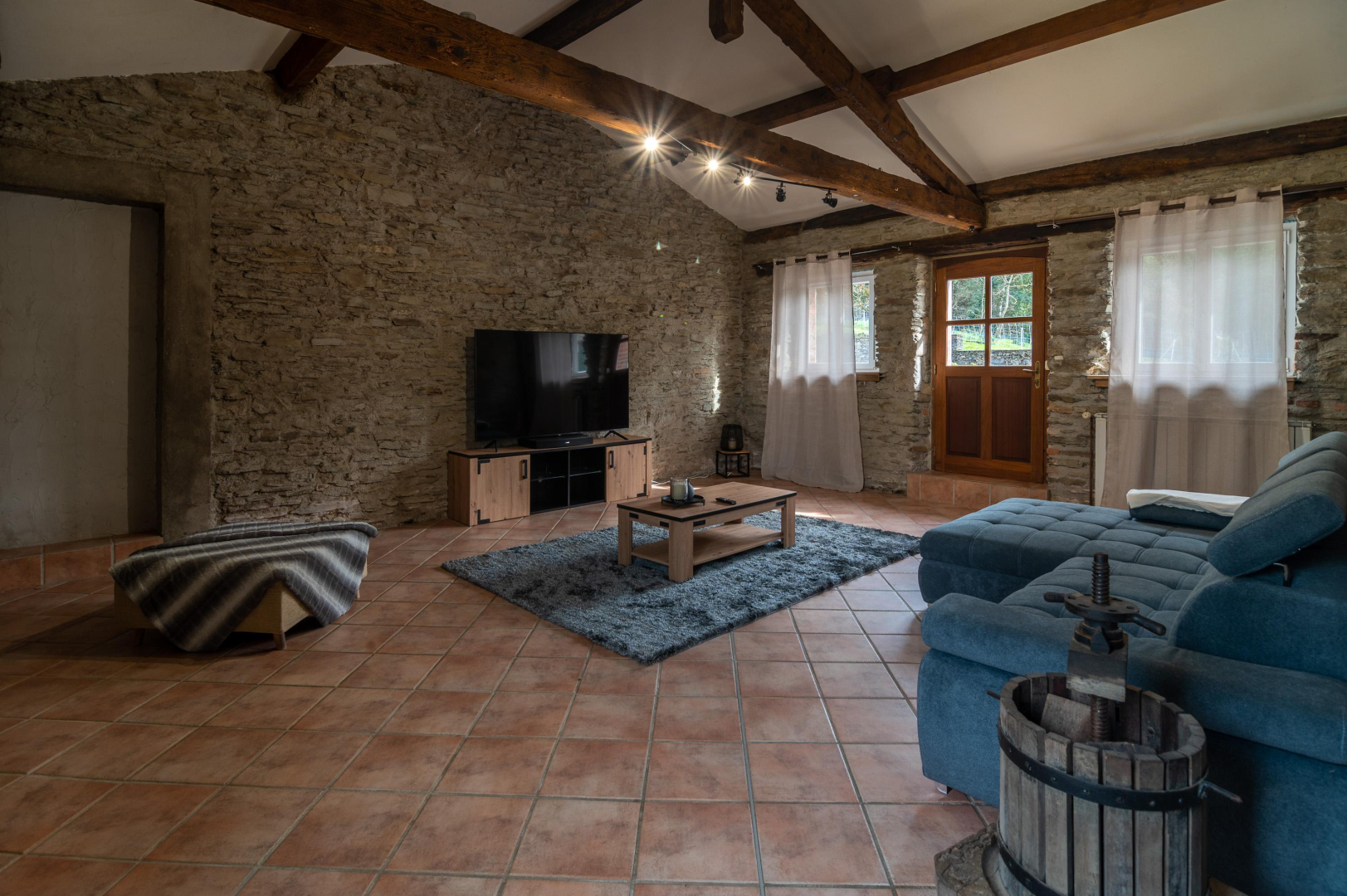 Deux entrées possibles pour accéder au gîte : - une première pièce donnant sur le salon avec cheminée et télévision. - la deuxième entrée donne sur une grande salle de réception équipée d'un home cinéma, un compte Netflix disponible gratuitement, avec un canapé convertible offrant un couchage en 160x200cm pour 2 personnes supplémentaires. - une cuisine entièrement équipée ouverte sur une salle à manger. Cuisine équipée d'un réfrigérateur avec compartiment congélateur, four, machine à café Nespresso©, grille pain, bouilloire, micro-onde et lave-vaisselle. - WC indépendant - une buanderie avec un lave-linge - une connexion wifi gratuite
